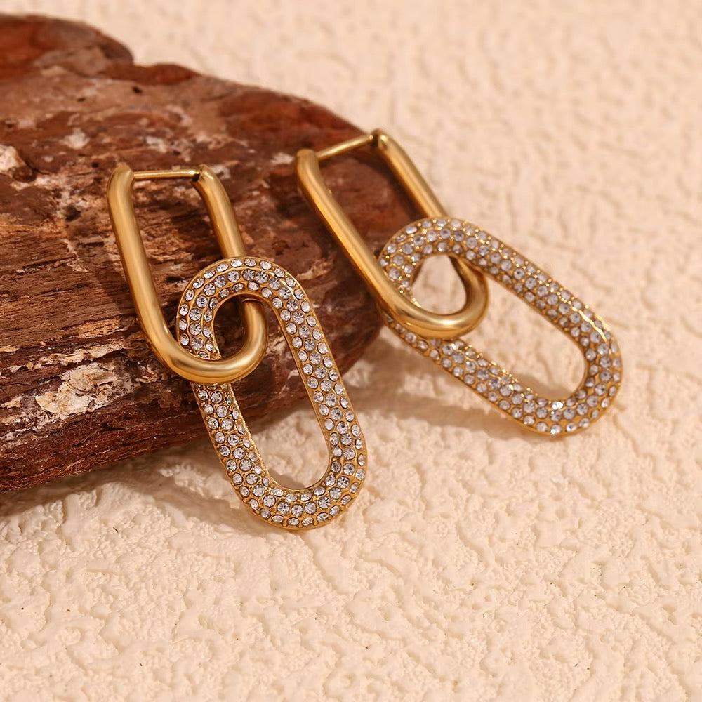 Chic geometric hoop earrings encrusted with sparkling white stones. Their modern design combined with a brilliant shine makes them a statement accessory, perfect for elevating any outfit with contemporary elegance.